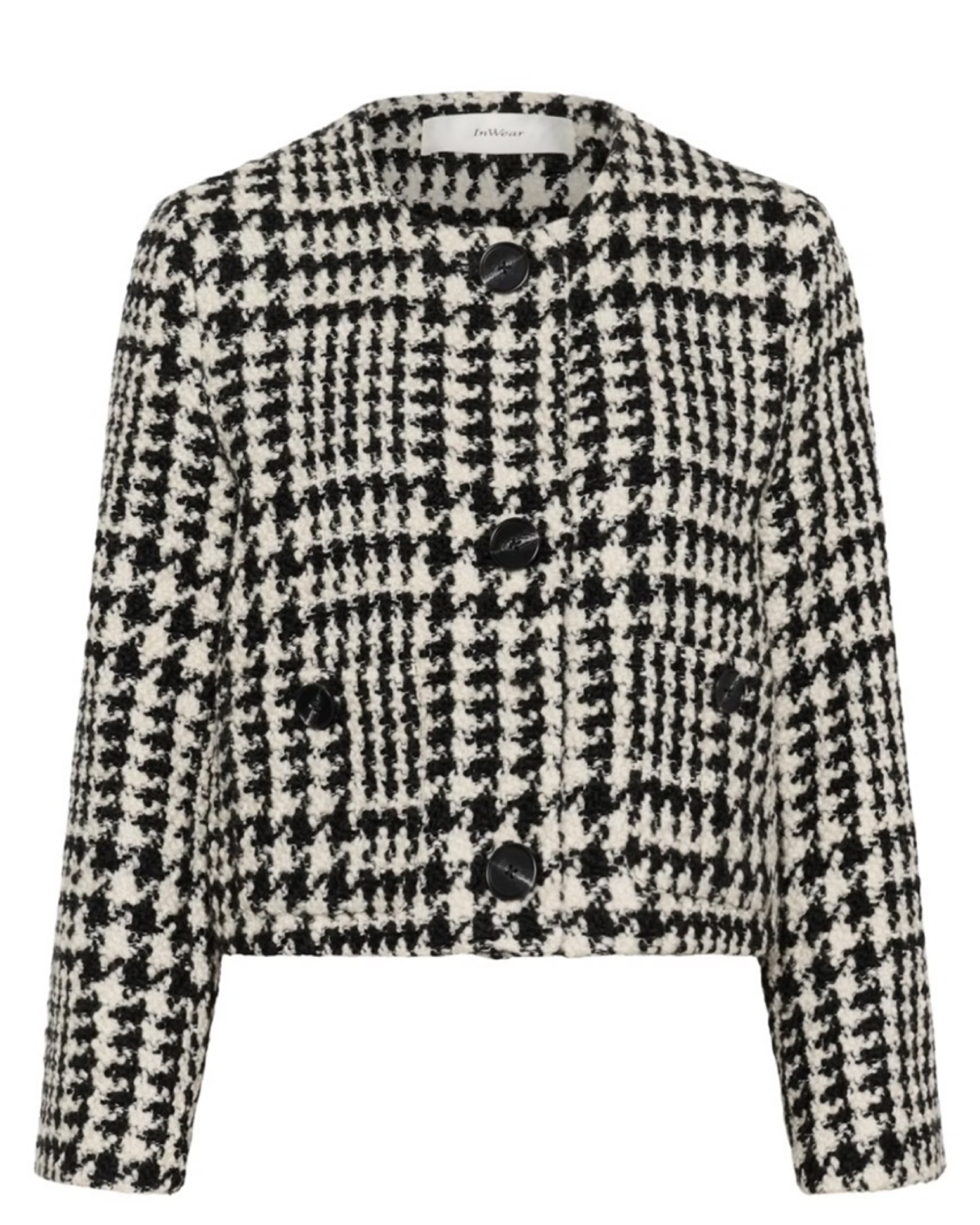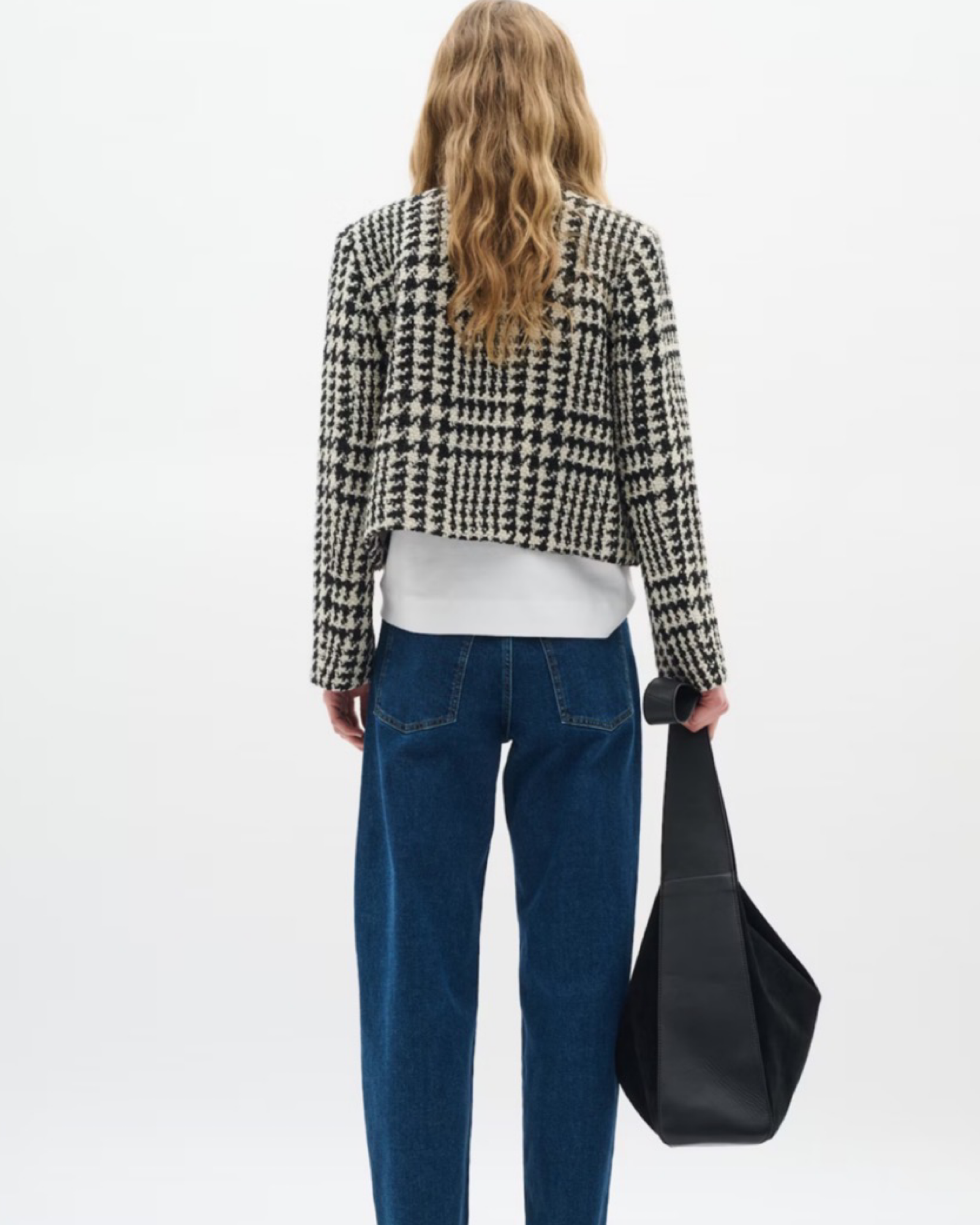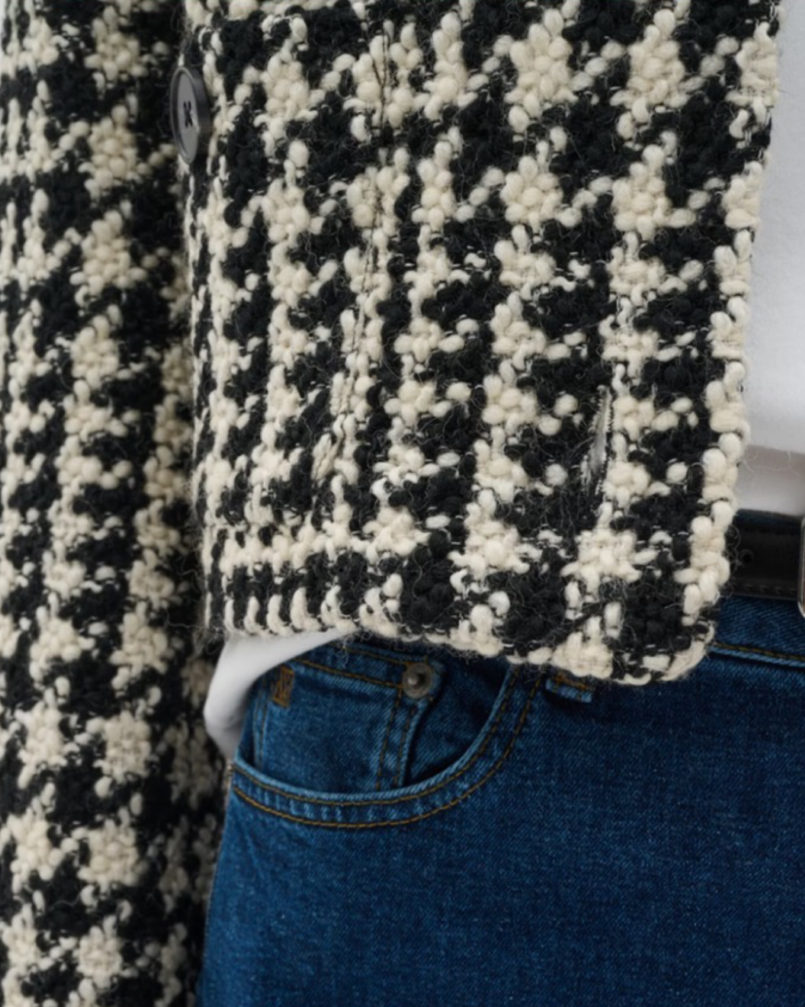Women’s short jacket offers a timeless cropped fit, crew neckline, long sleeves, and signature large buttons for modern style. Versatile for both casual and elegant outfits, providing comfort and polished appeal.