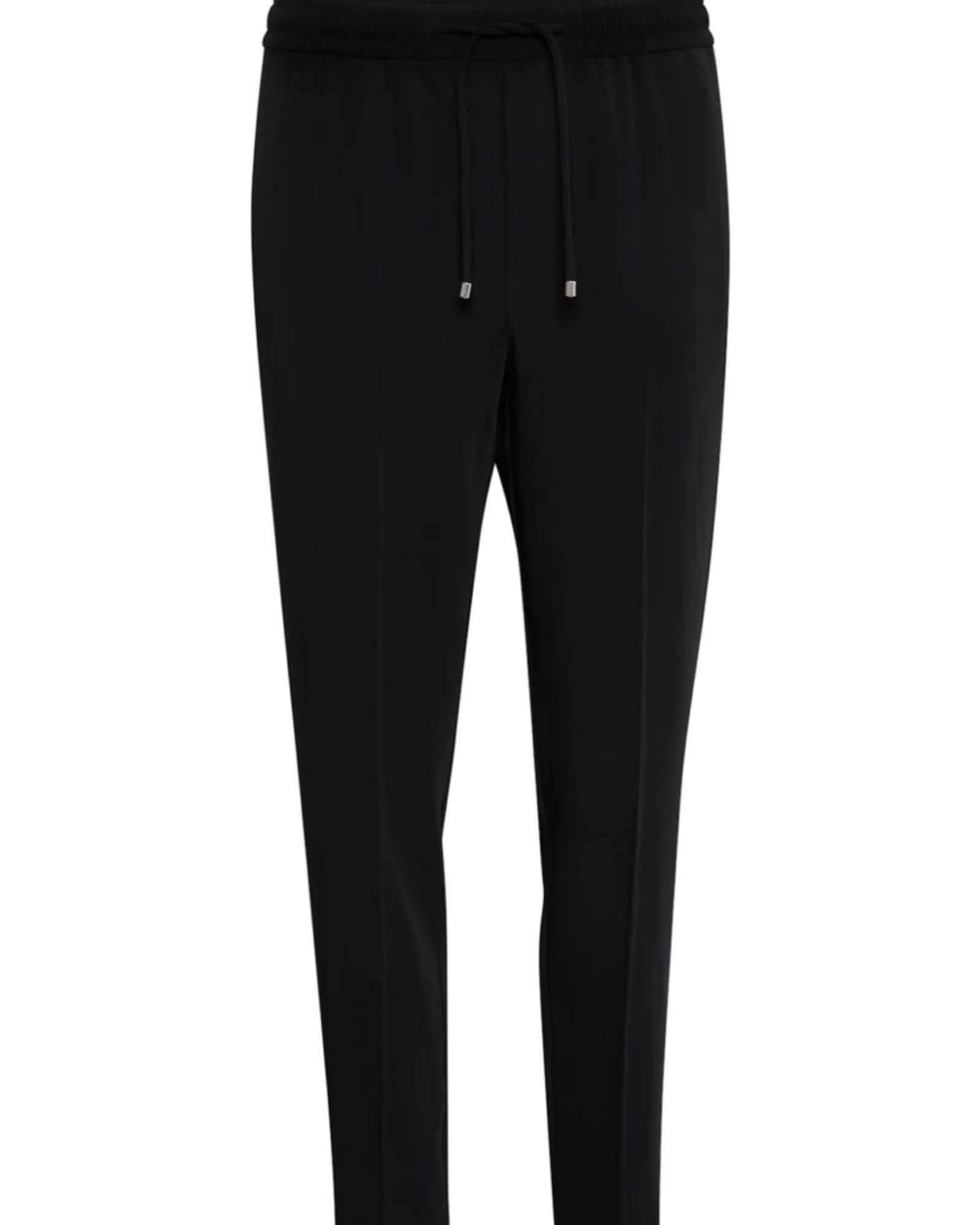 Tapered trousers feature a clean silhouette with an elastic waistband and adjustable drawstring. Soft, fluid texture offers effortless style and ease.