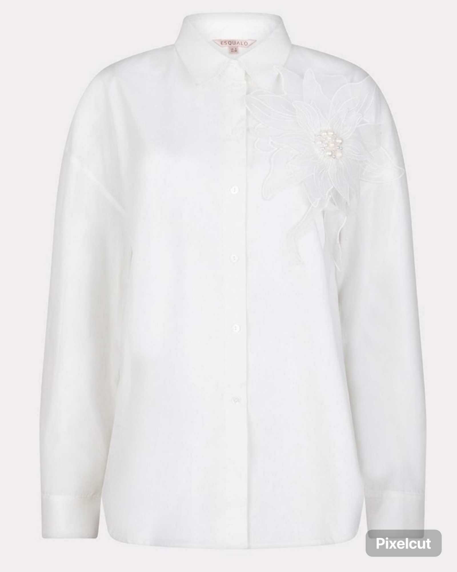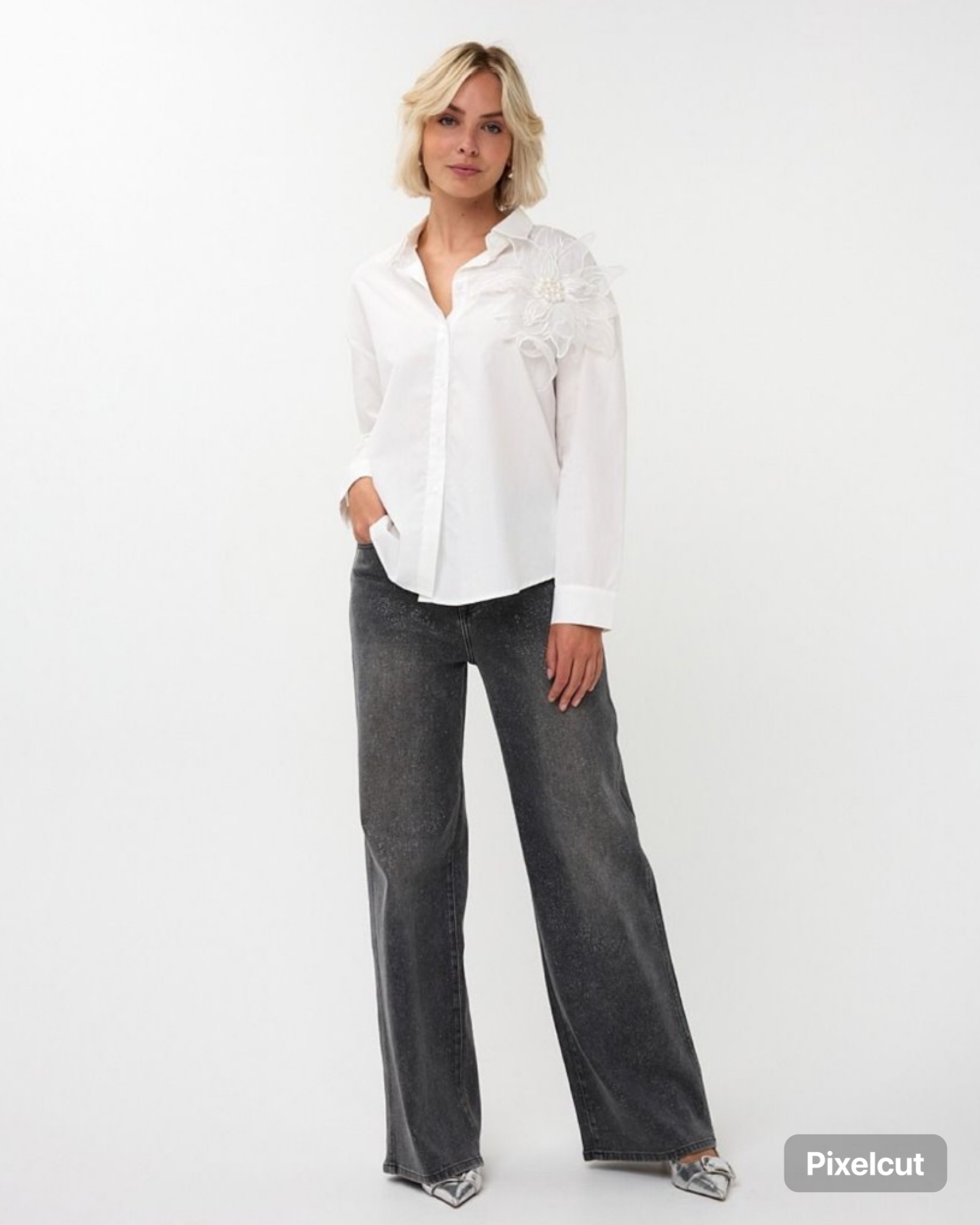 Elegant blouse with large flower on the left shoulder made from 100% cotton.