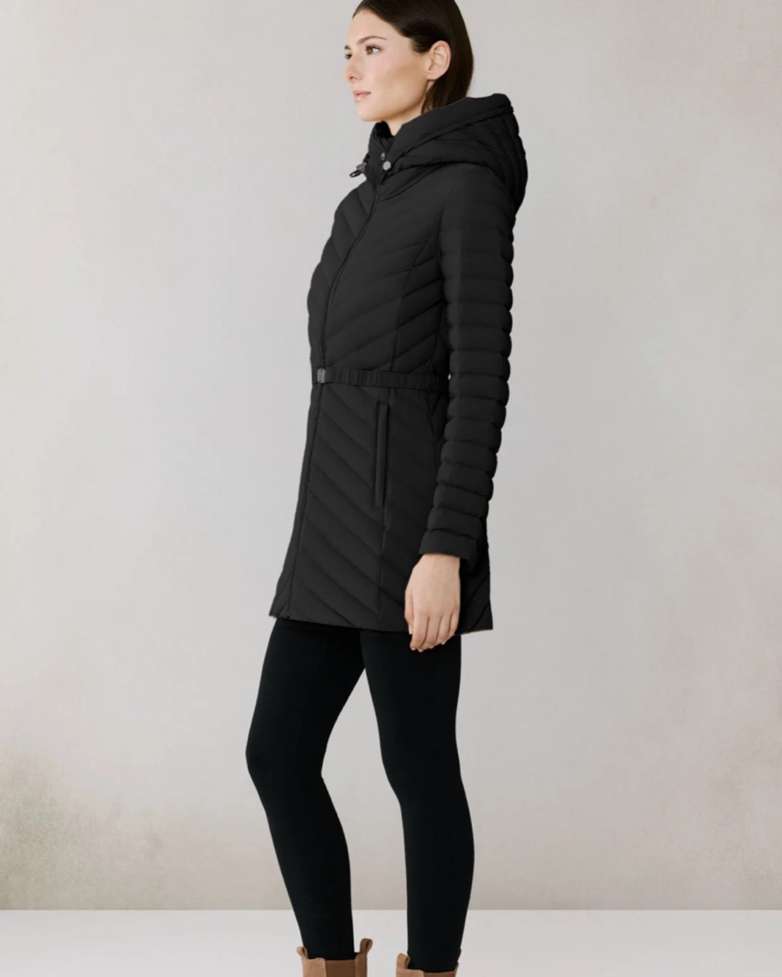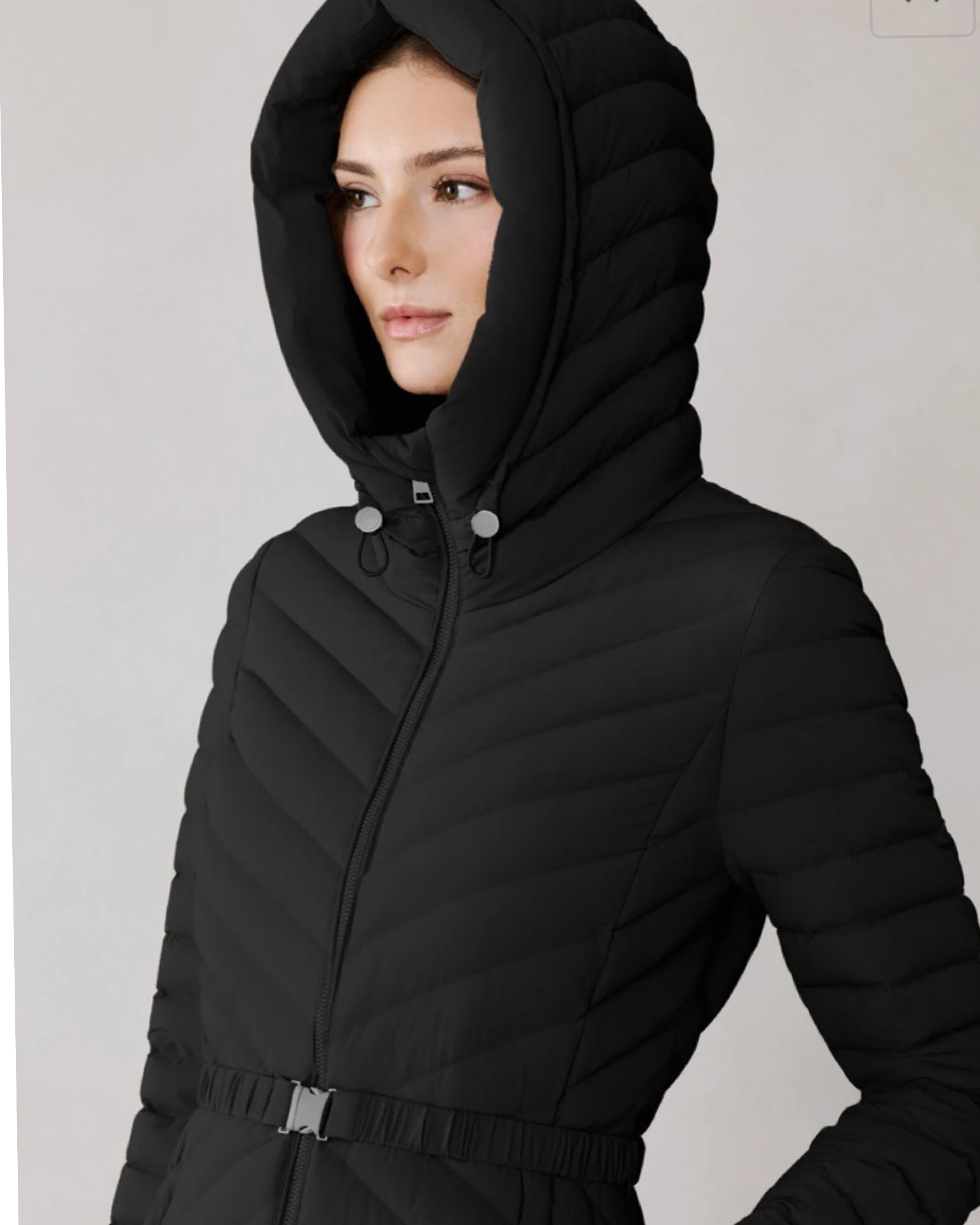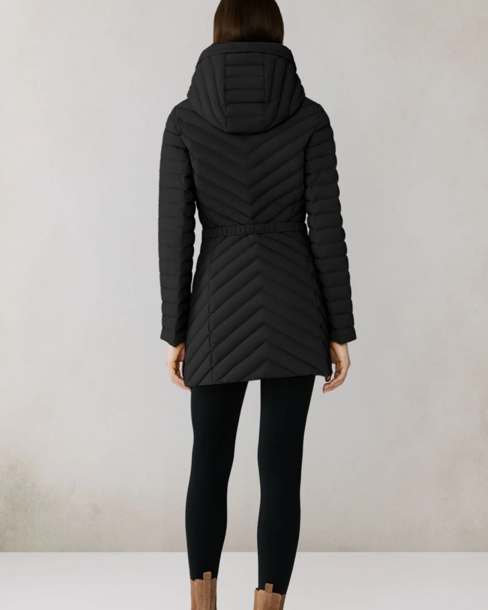 The ESTELLE by SOIA & KYO combines sleek design with functional warmth. Its chevron quilting and slim fit create a flattering silhouette, while the adjustable hood and elasticized belt offer customizable comfort. Filled with RDS-certified down and made from 4-way stretch down-proof fabric, it ensures insulation, comfort, and ease of movement.