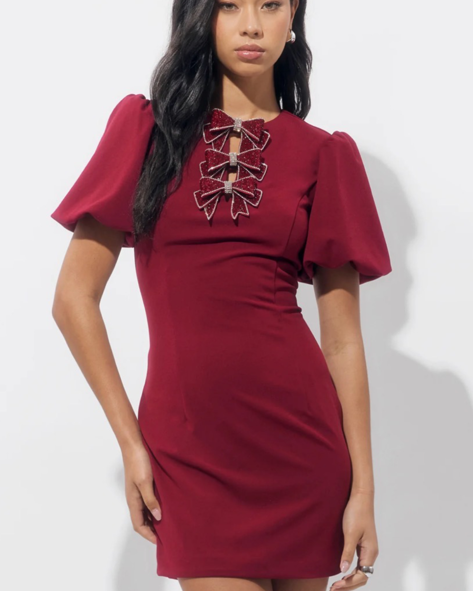 This dress is crafted from a comfortable, stretch fabric in a rich burgundy color. It features a high, round neckline and a fitted silhouette with a playful mini length. The long sleeves are accented with stunning rhinestone embellishments at the cuffs, adding a touch of glamour and sparkle. The dress's sleek design and dazzling details make it a standout choice for an evening out.