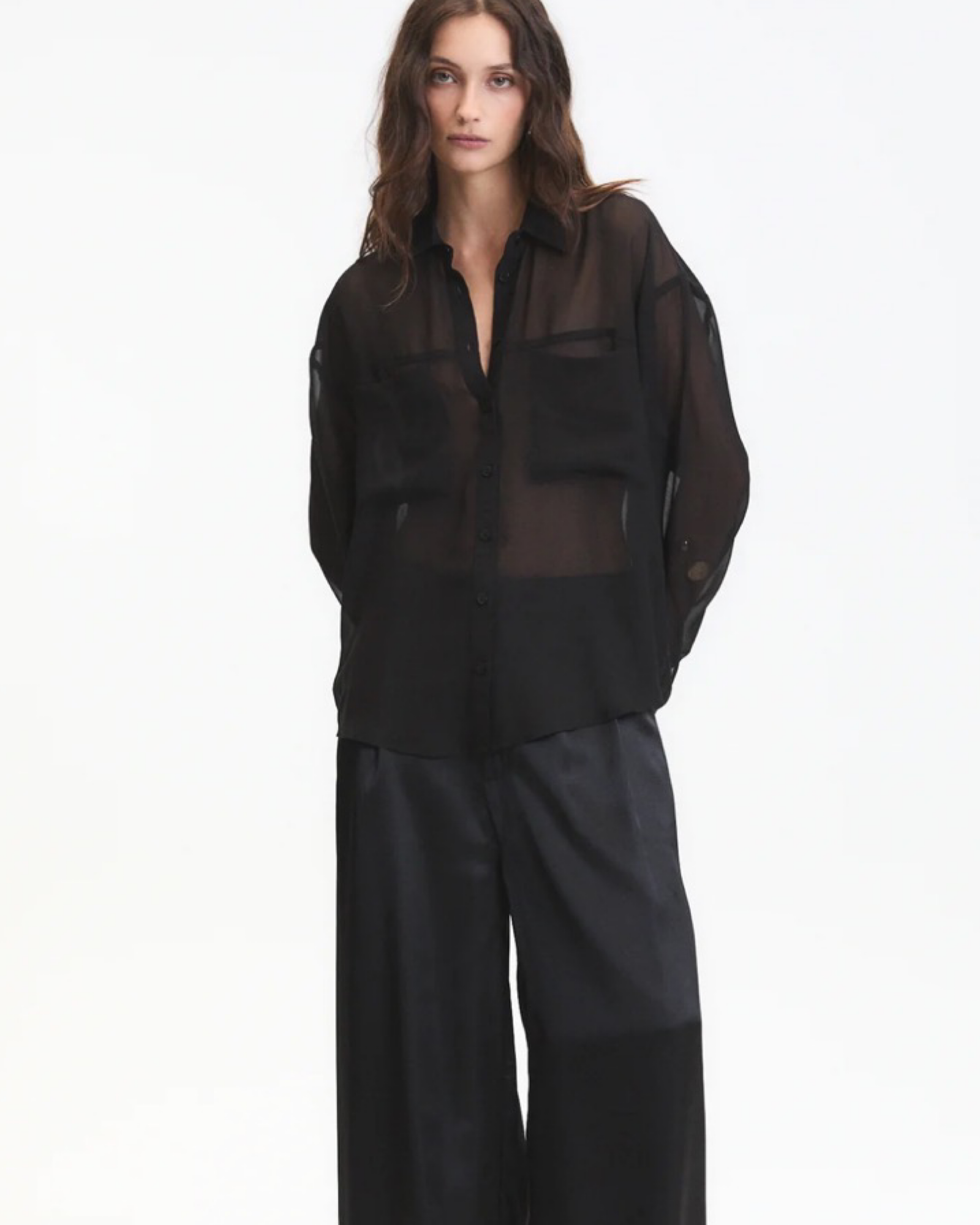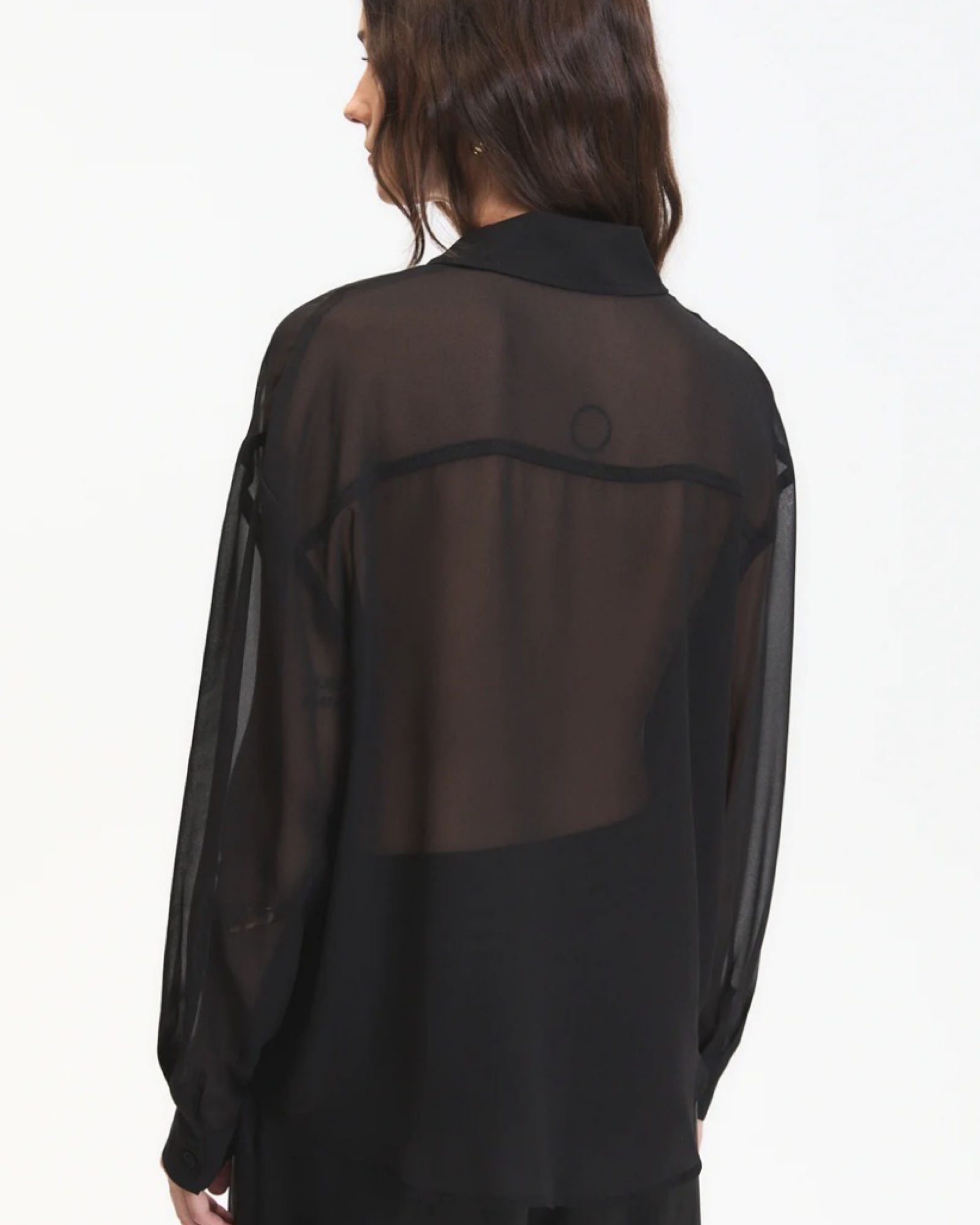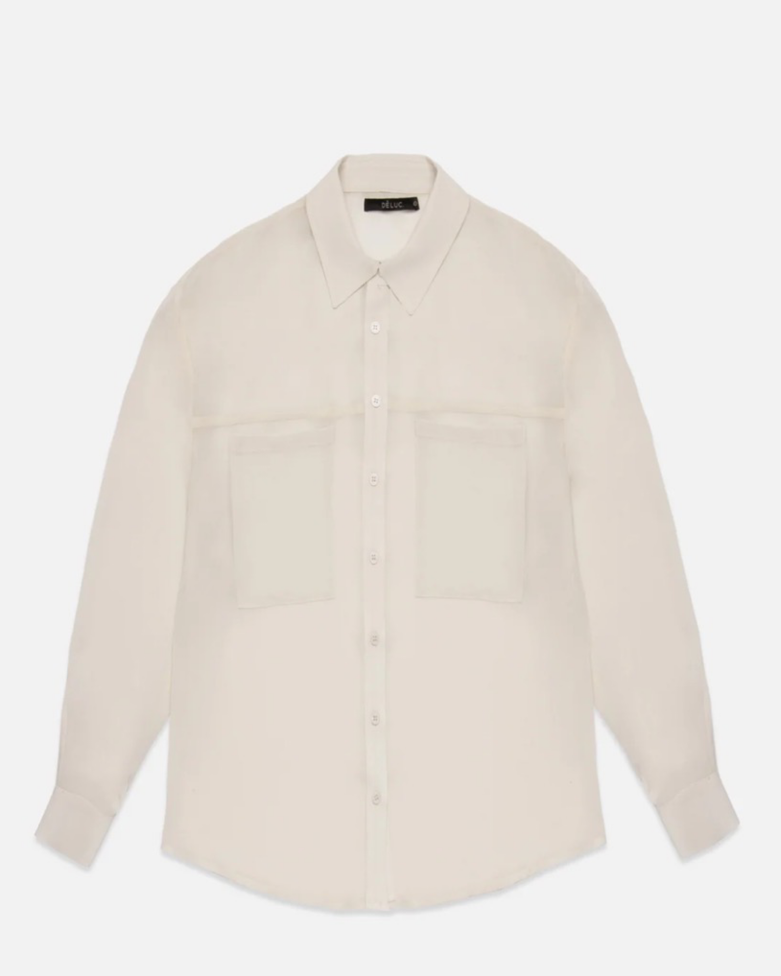 Sheer shirt with lapel collar and long sleeves with buttoned cuffs. Patch pockets below front yoke. Curved hem. Front button closure